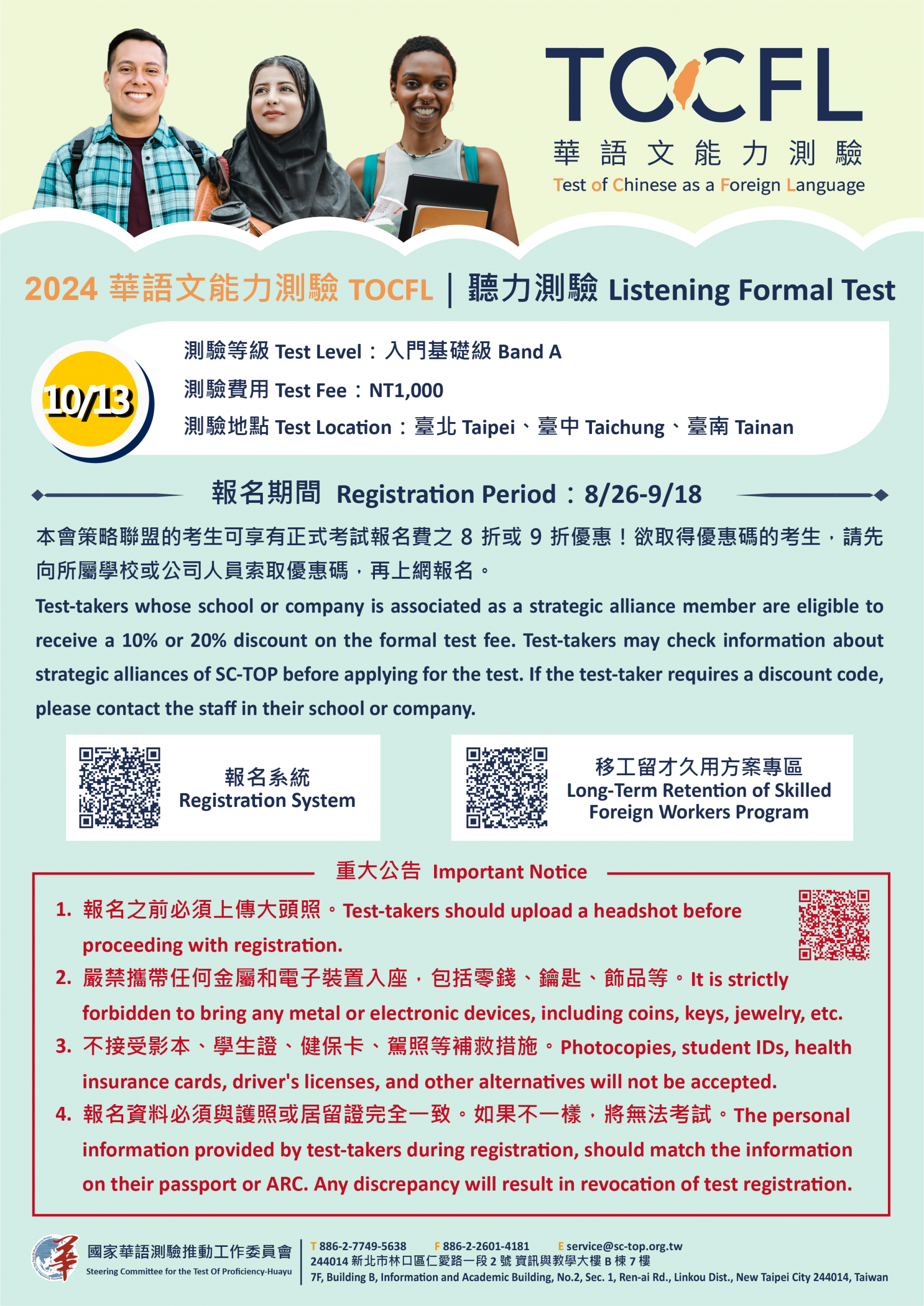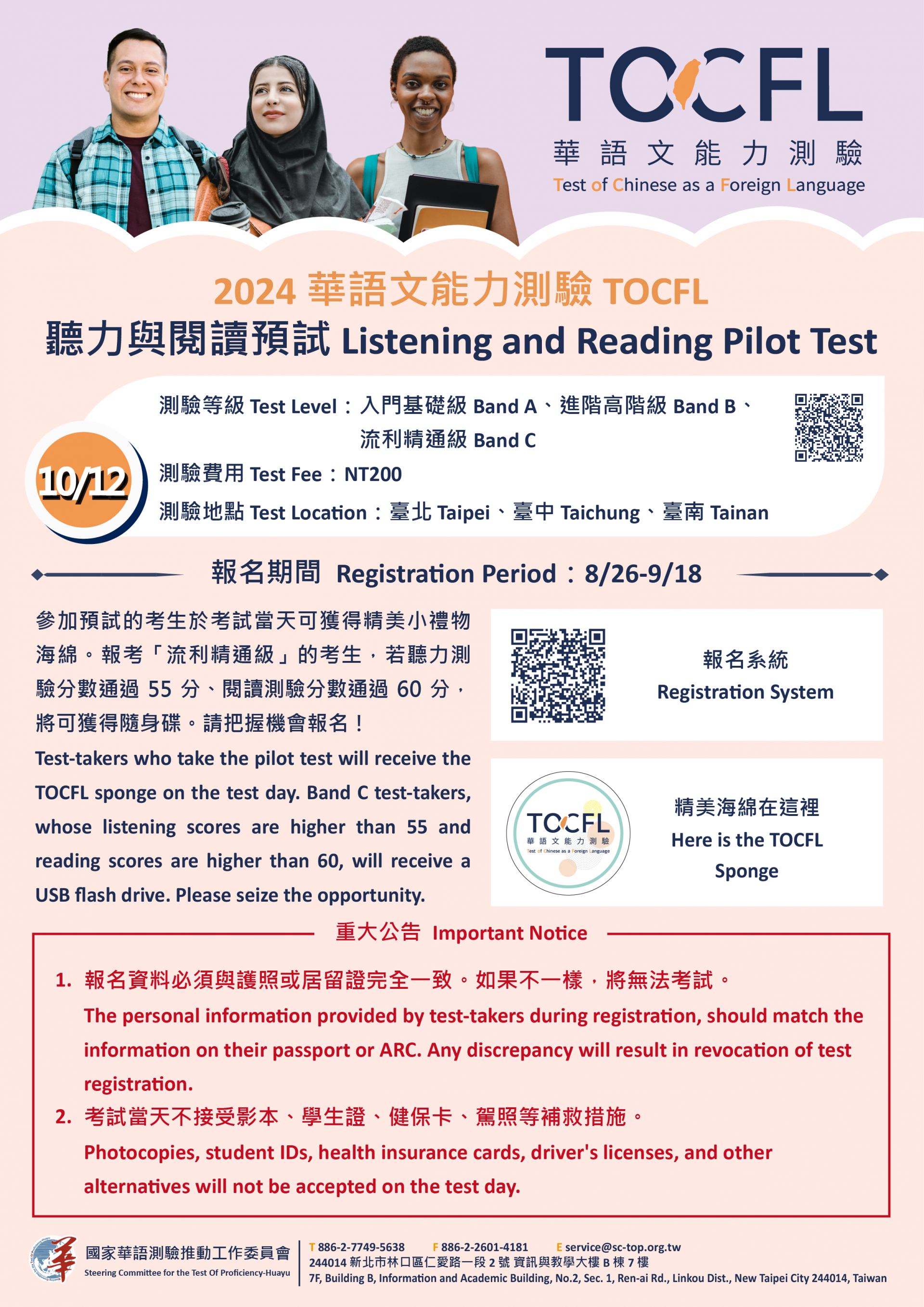 | 主旨: | 轉知國家華語測驗推動工作委員會(以下簡稱華測會)辦理「華語文能力測驗」,113年10月12日聽力與閱讀測驗預試及10月13日聽力測驗正式考試一案,請查照。 |